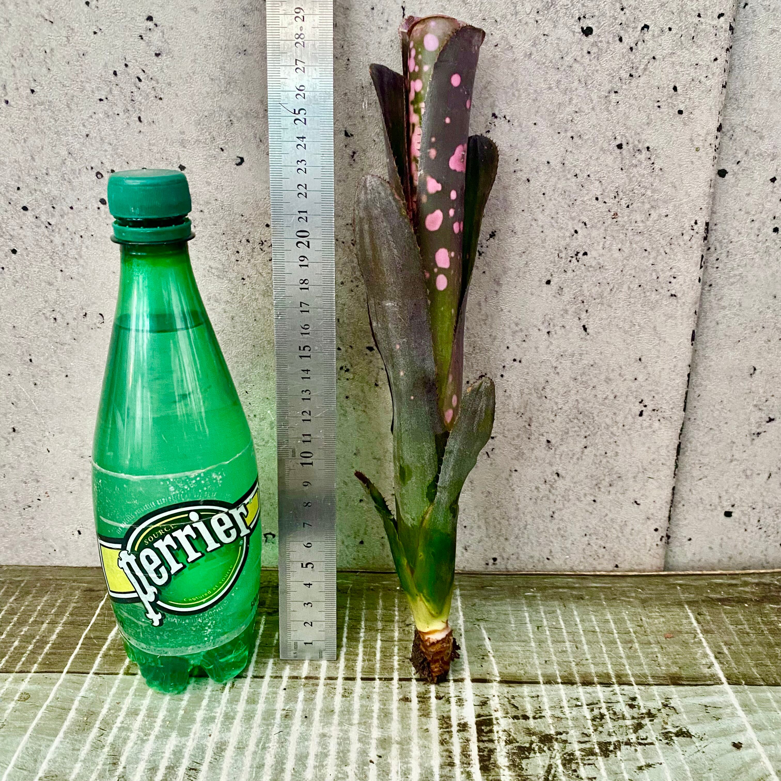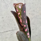 黒味を帯びた葉に鮮やかなピンク色のスポットが入る人気の品種です。