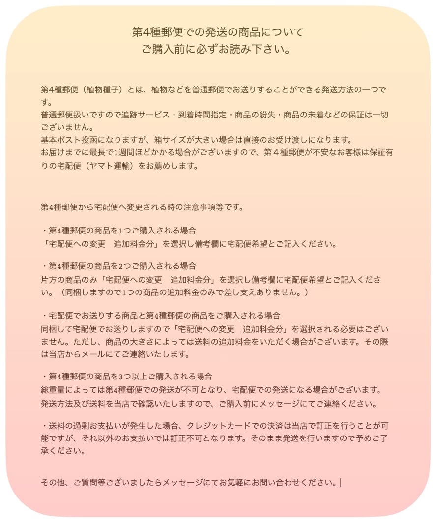・暑い時期は配送中に高温障害や蒸れなどで植物の状態が変化する可能性がございます。その場合の返品、ご返金はお受けできません。ご了承くださいますようお願い致します。