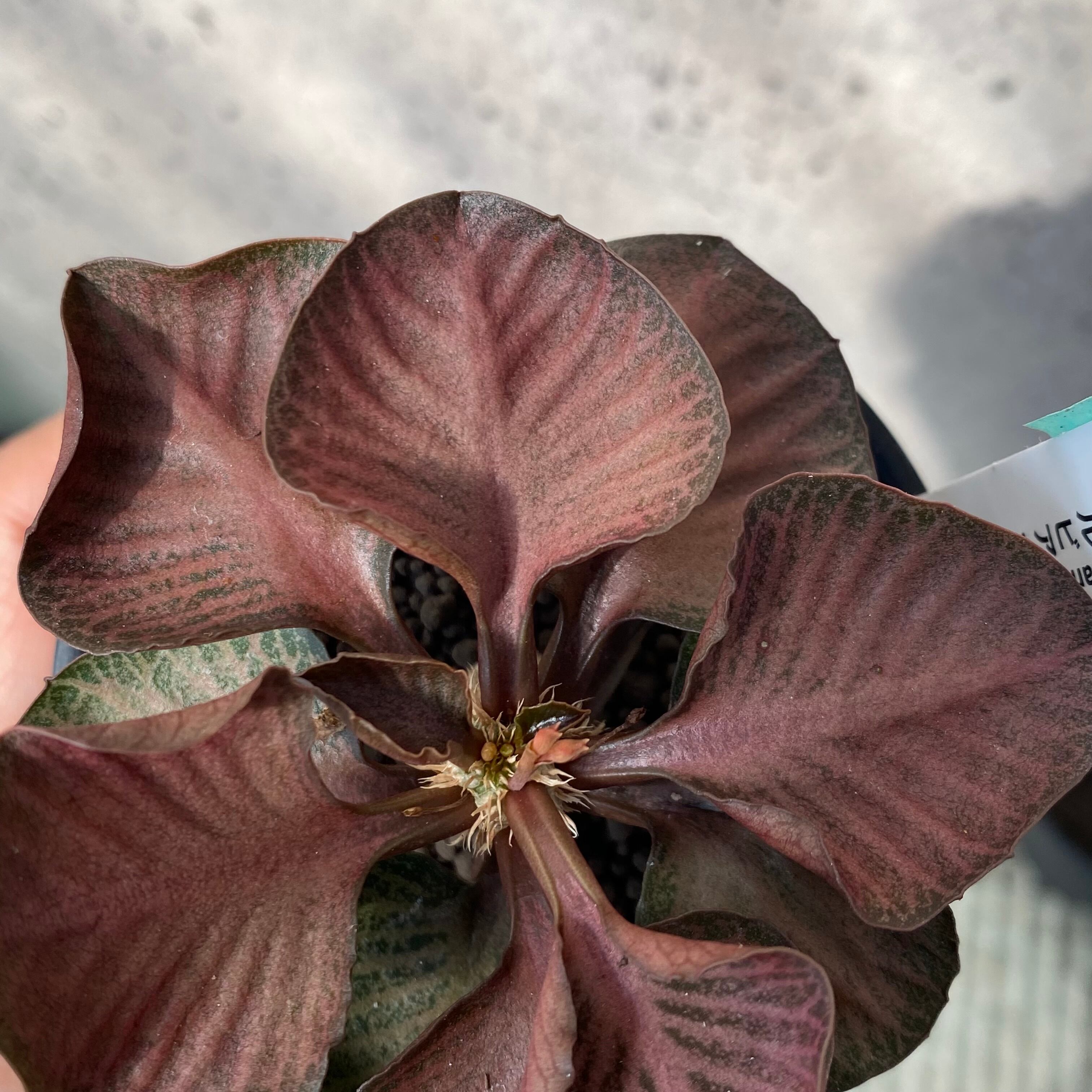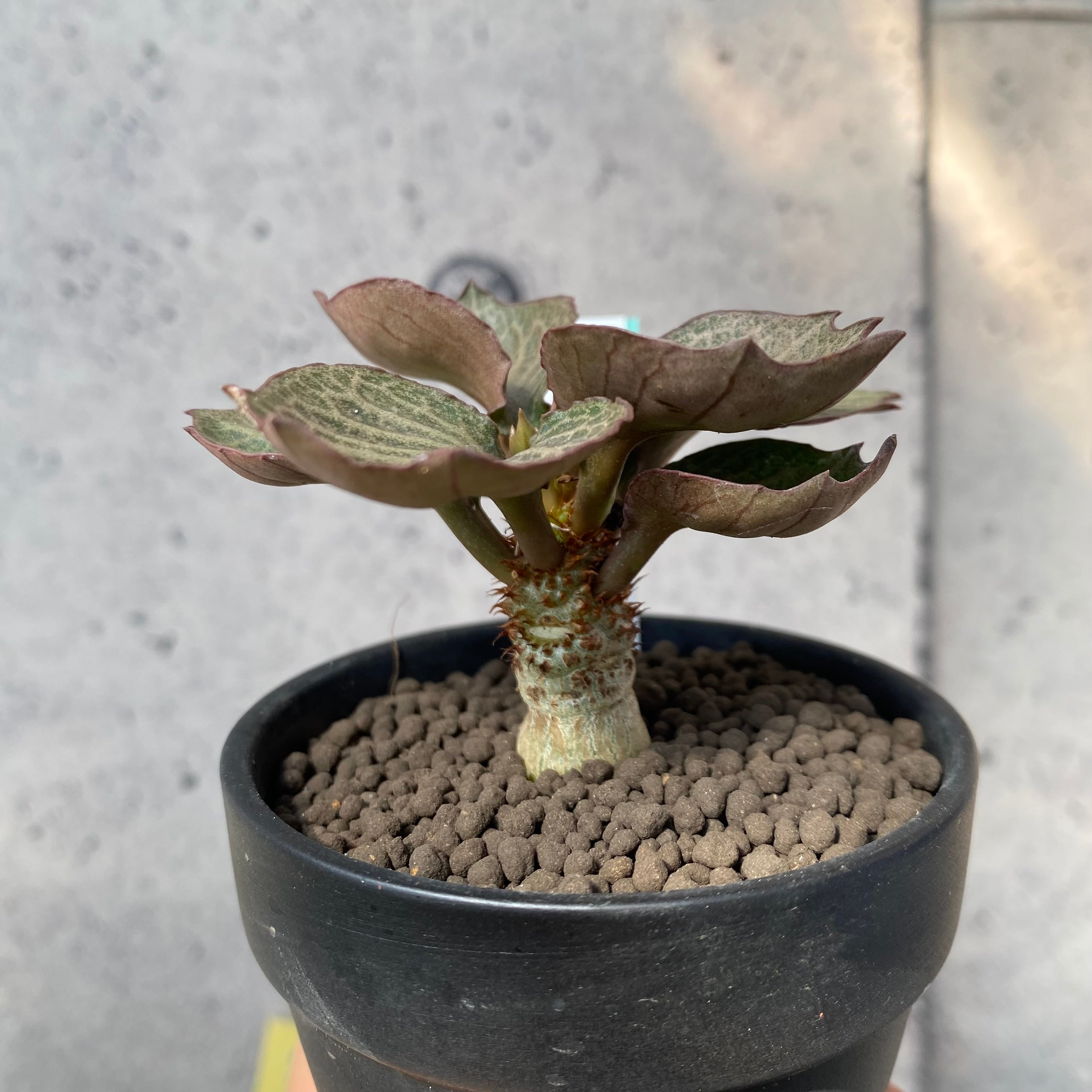 やや肉厚でカラフルな葉っぱとぷっくりとした塊根を併せ持つユニークな植物です。