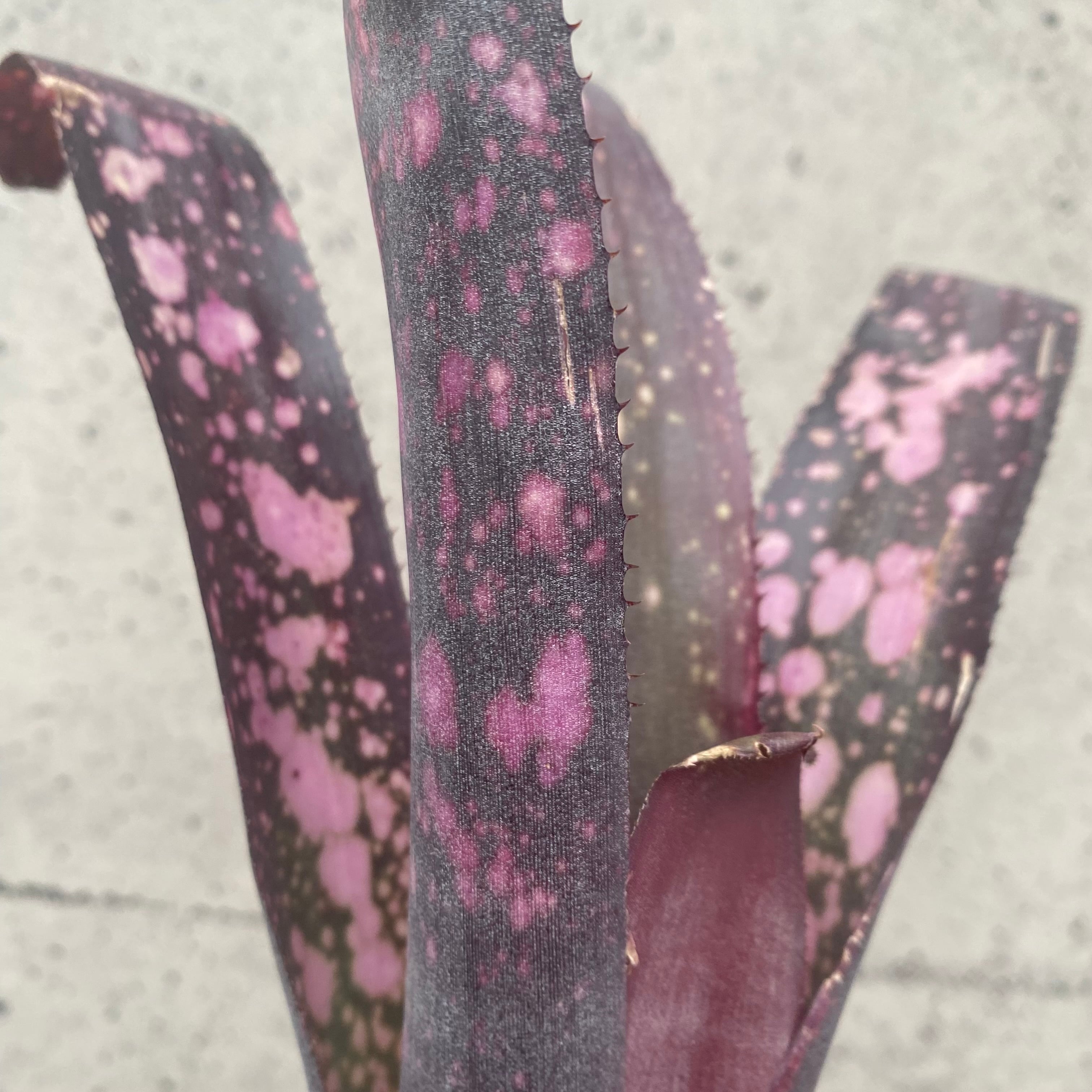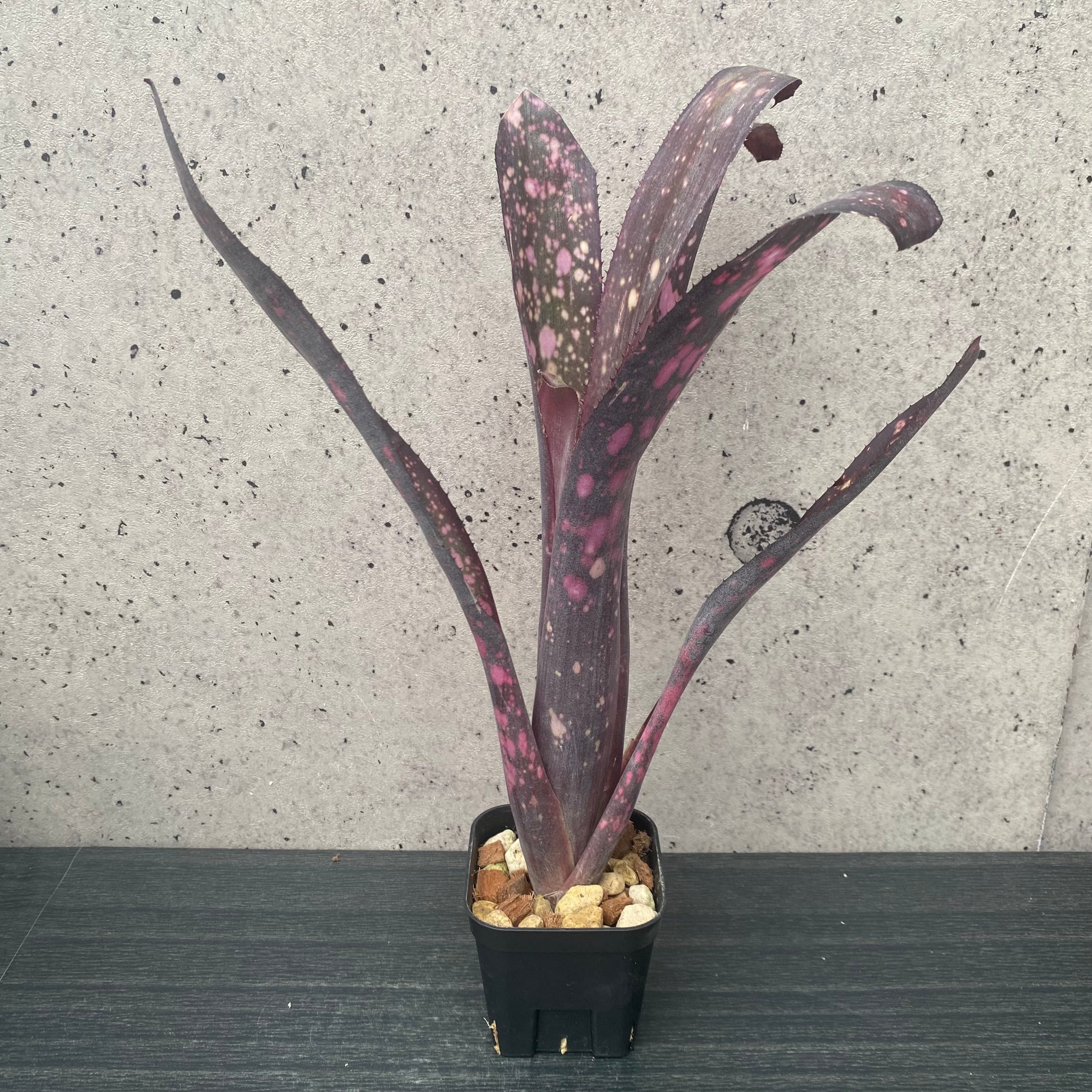深みのある赤紫色に色鮮やかなショッピングピンクのスポットが散りばめられている大変美しい株です。