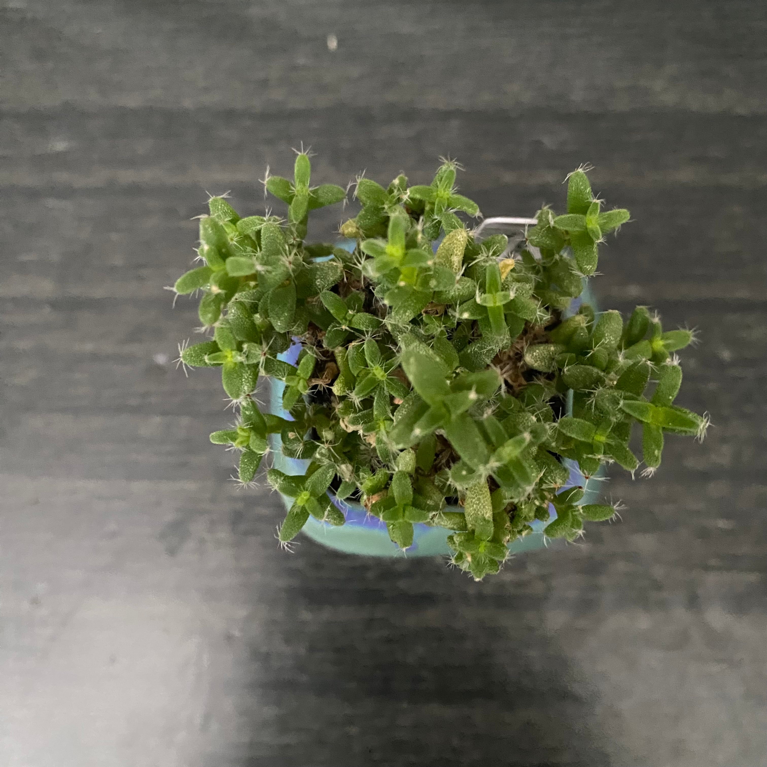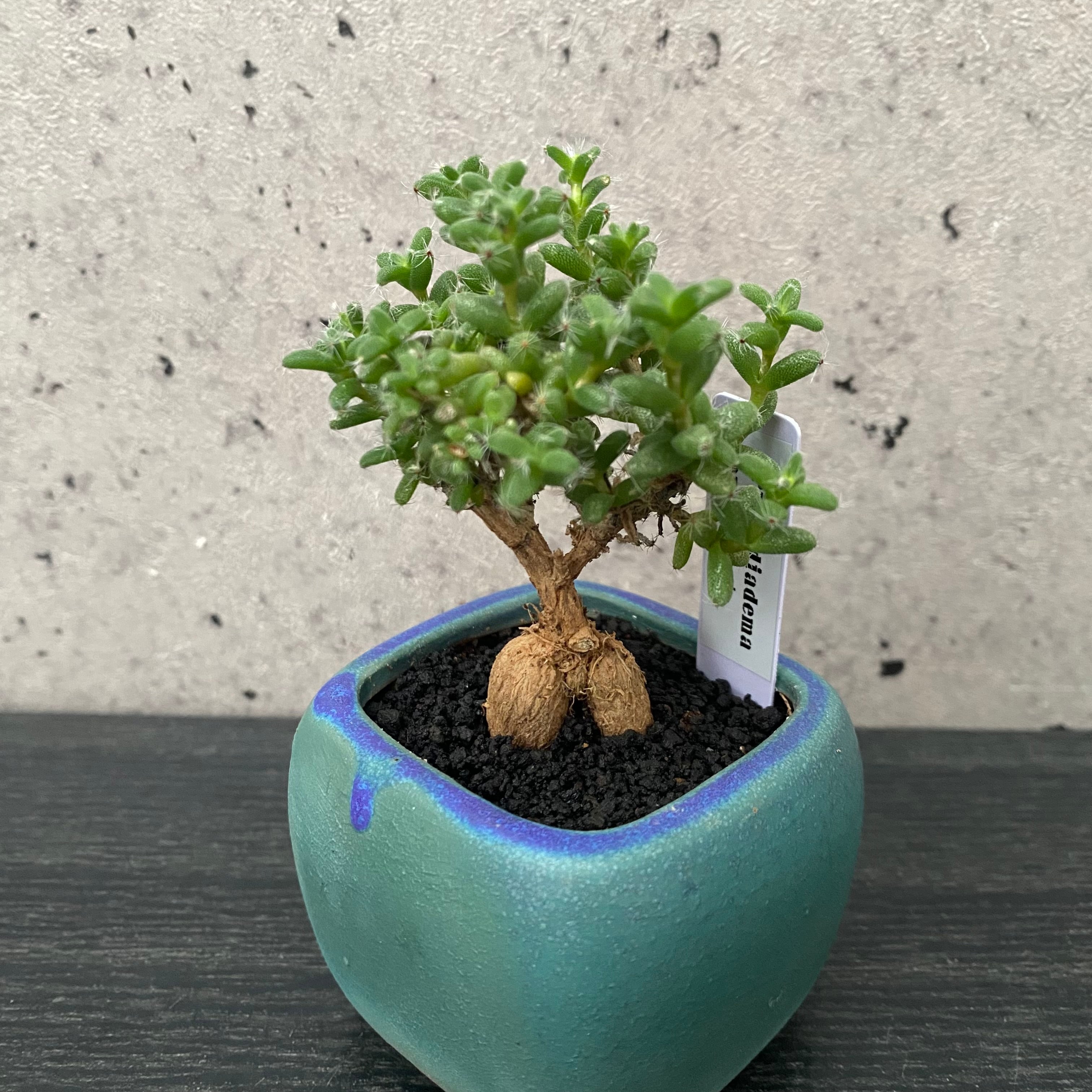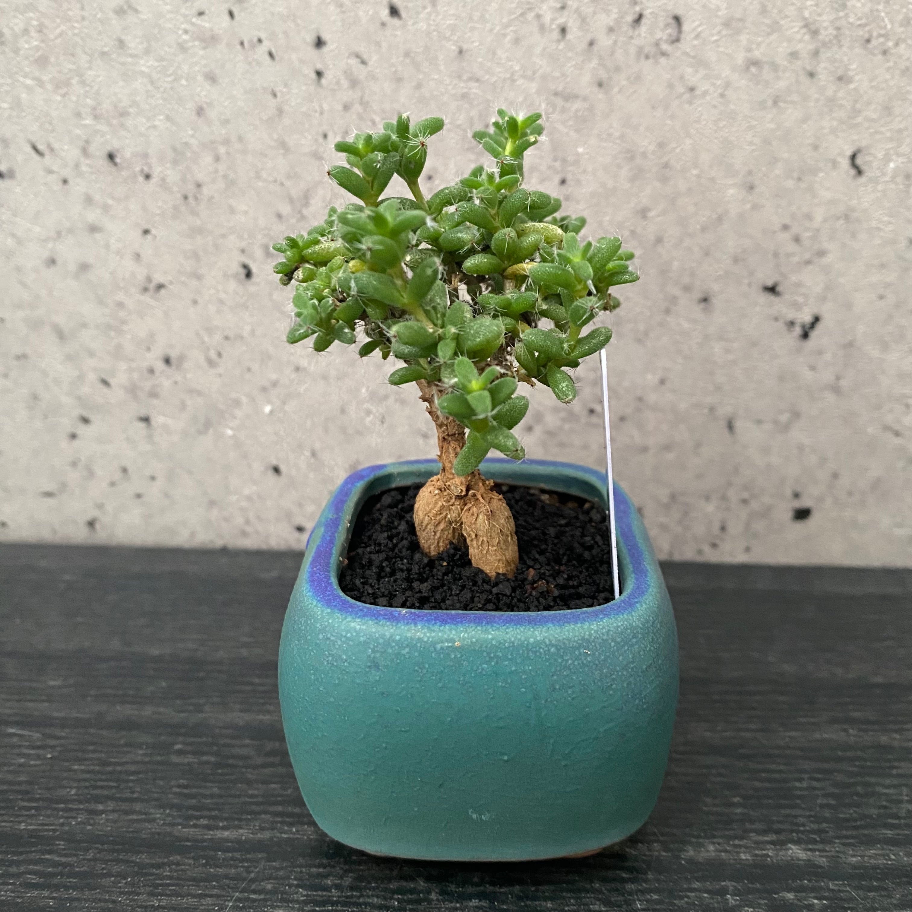ターコイズブルーのコロンとしたスクエア型の小さな陶器鉢に植えてあります。