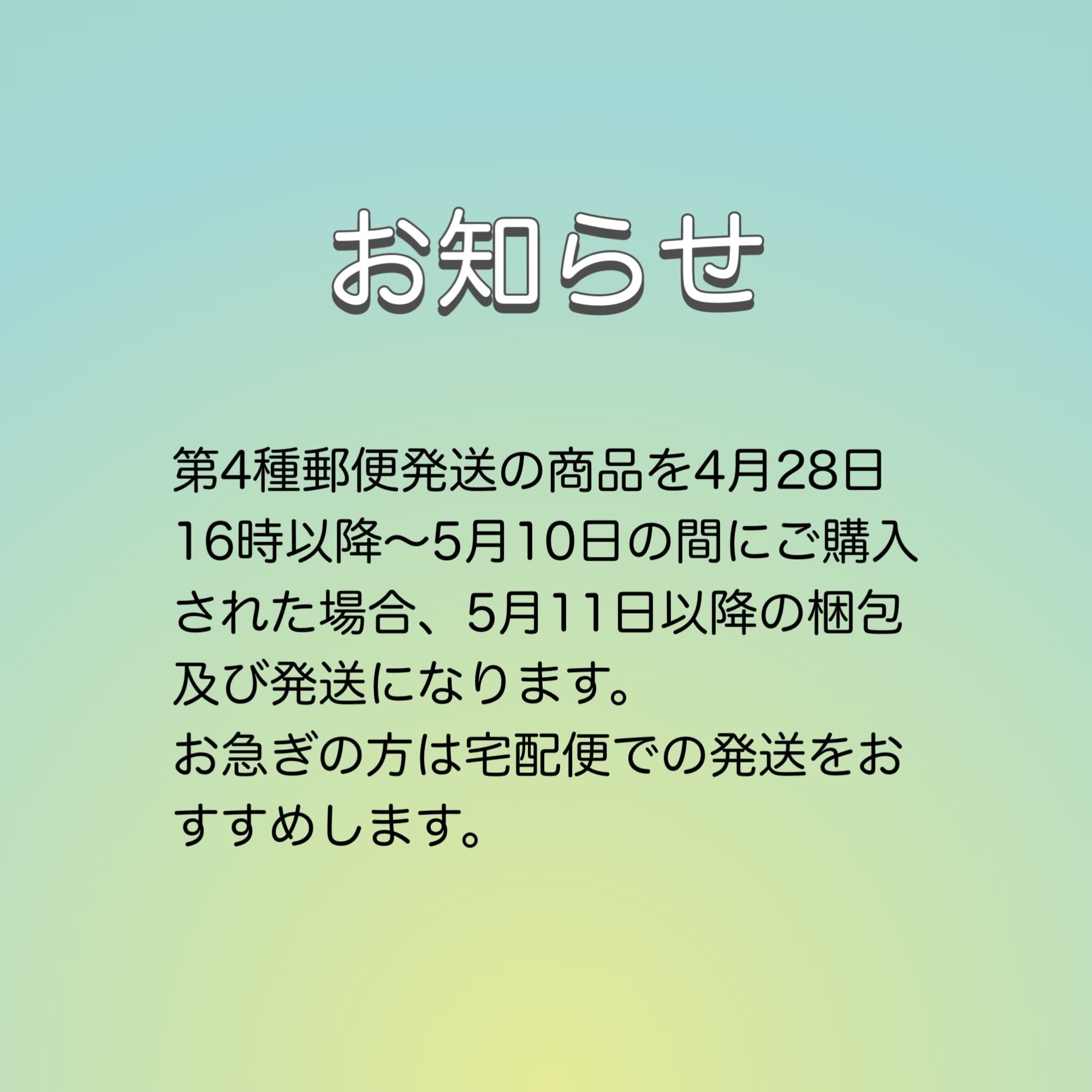 ・第四種での発送は普通郵便と同じ扱いとなりますのでお届けまでに最大で1週間かかる場合もあります。また追跡番号や補償もありません。リスクがあることをご了承おきください。